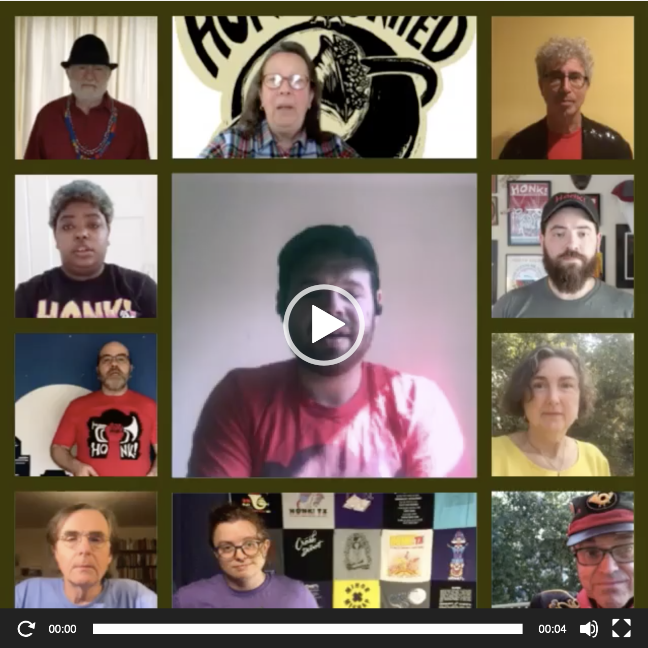 So, this year, we invited every HONK! affiliate out there – organizers, musicians, artists, and activist partners – to contribute content to HONK!United. We have also solicited a series of online workshops related to our cultural and political practices. Imagine being able to celebrate the power of brass and percussion from Boston to Benin, Rio to Rome and Paris, London to Wollongong, not to mention Austin, New York, Seattle, Pittsburgh, New Orleans, Montreal, Vancouver, and elsewhere … all at the same time. This is what we are offering.